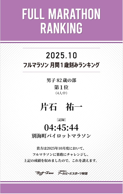 ランニングポータルサイトのRUNNETが集計・発表するフルマラソンにおける月間ランキングにおいて、片石さんが82歳の部で1位になりました。